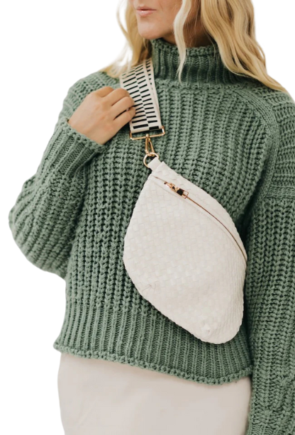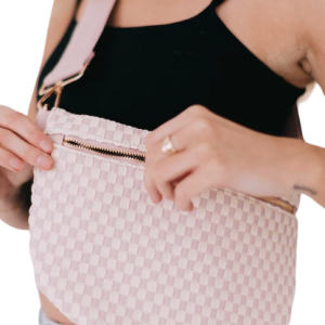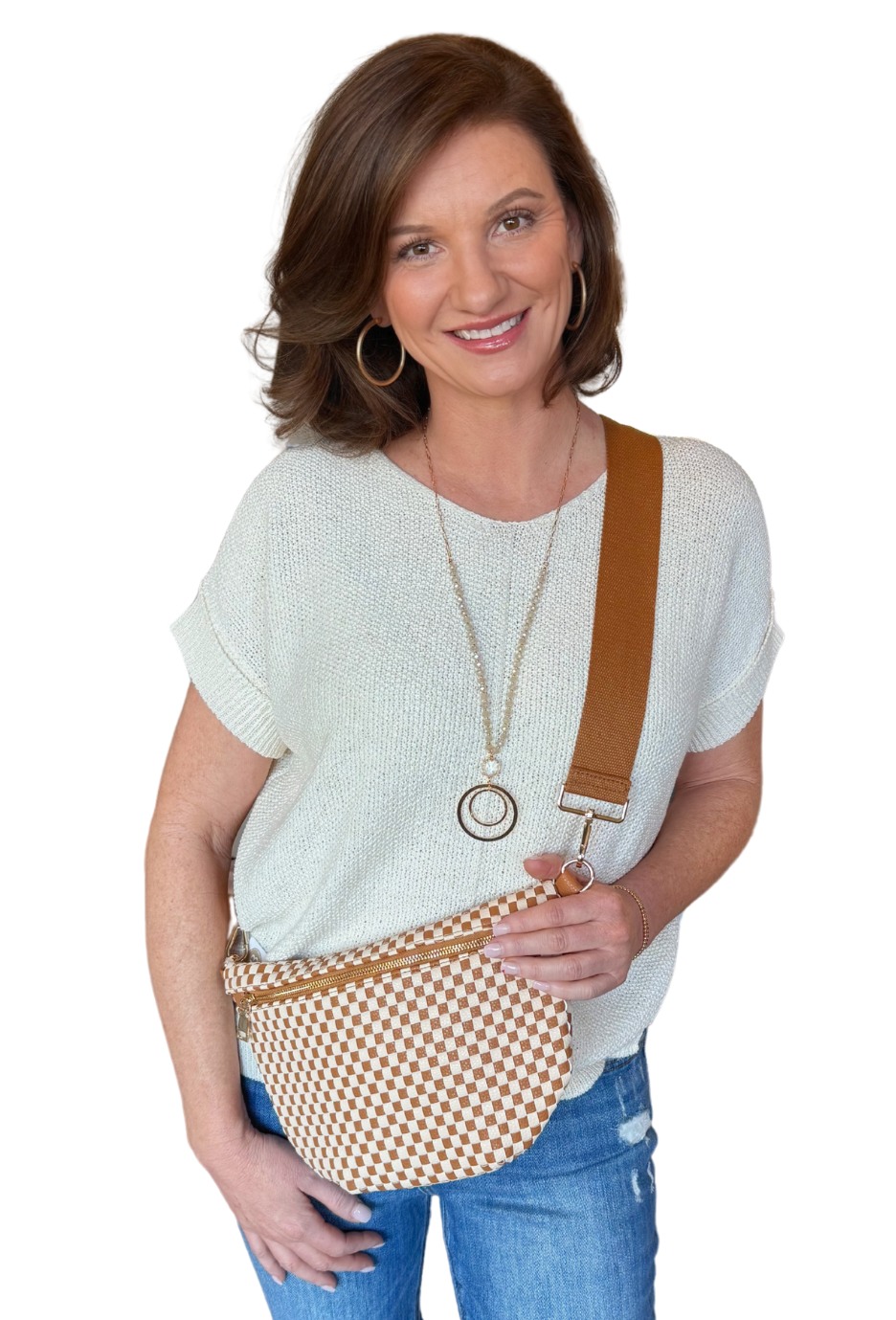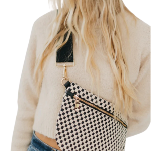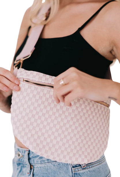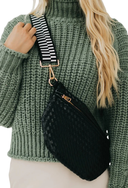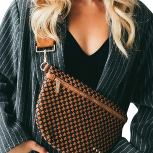Meet the Westlyn Woven Bum Bag! Gorgeous woven vegan leather in brown, black, and cream with a unique block design on the strap gives us edgy, rocker vibes. We also have it available in checkered black and checkered brown! Beautiful hardware with a zipper closure with beige and black chevron interior, and a zippered slash pocket on the inside. This crossbody bag is the perfect accessory to elevate any outfit!